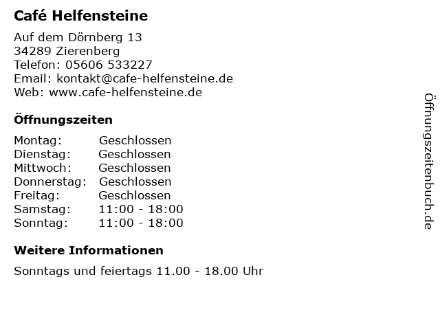 | Öffnungszeiten Café Helfensteine in Zierenberg anzeigen | |