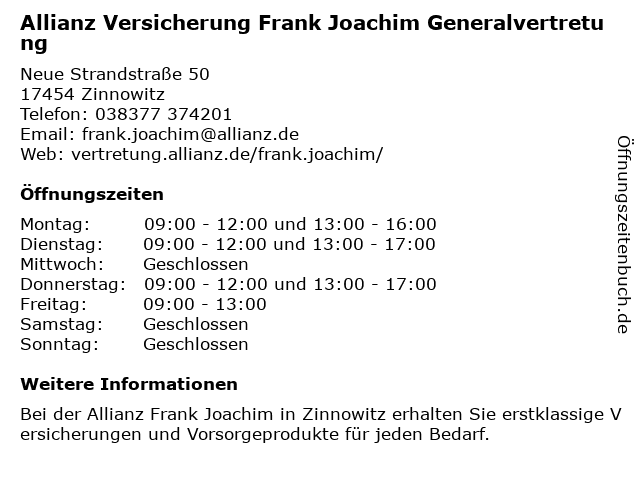 1 Allianz Versicherung Nicole Stübe Generalvertretung (Entfernung: 0,00 km) Neue Strandstraße 50, 17454 Zinnowitz 2 Allianz Versicherung Susann Frohberg Generalvertretung (Entfernung: 9,08 km) Bahnhofstraße 5, 17438 Wolgast 6 |