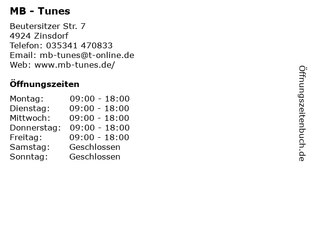 | Öffnungszeiten MB - Tunes in Zinsdorf anzeigen | |