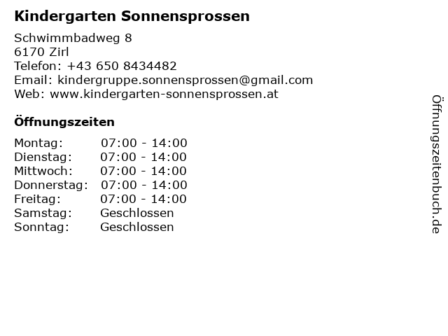 | Öffnungszeiten Kindergarten Sonnensprossen in Zirl anzeigen | |
