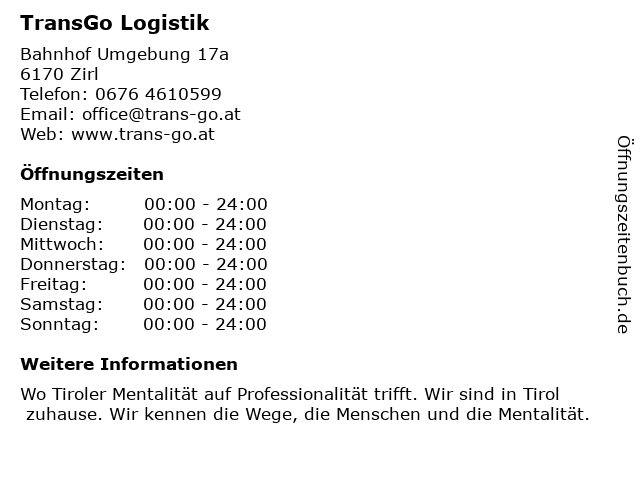 | Öffnungszeiten TransGo Logistik in Zirl anzeigen | |