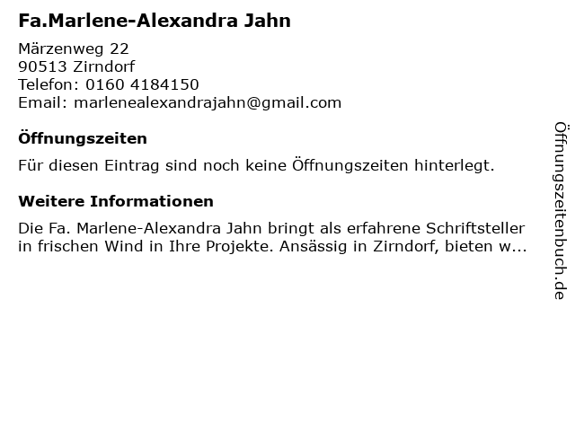 | Öffnungszeiten Fa.Marlene-Alexandra Jahn in Zirndorf anzeigen | |