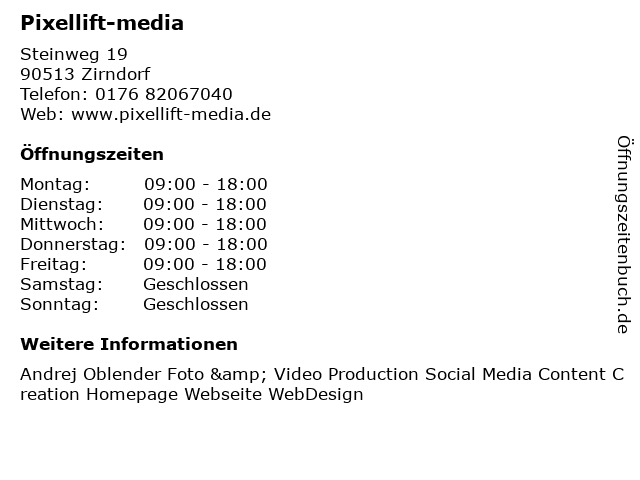 | Öffnungszeiten Pixellift-media in Zirndorf anzeigen | |