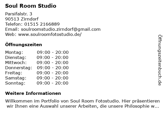 | Öffnungszeiten Soul Room Studio in Zirndorf anzeigen | |