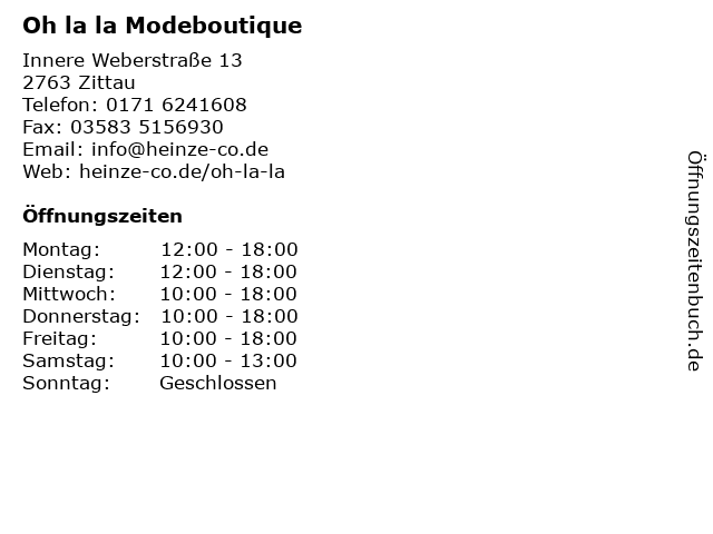 | Öffnungszeiten Oh la la Modeboutique in Zittau anzeigen | |