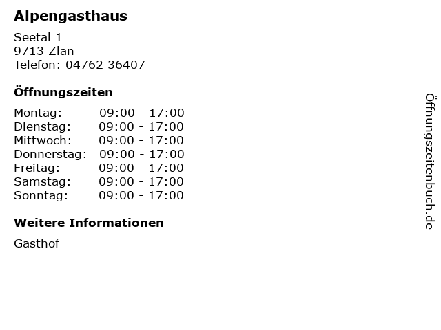 | Öffnungszeiten Alpengasthaus in Zlan anzeigen | |