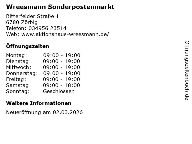 | Öffnungszeiten Wreesmann Sonderpostenmarkt in Zörbig anzeigen | |
