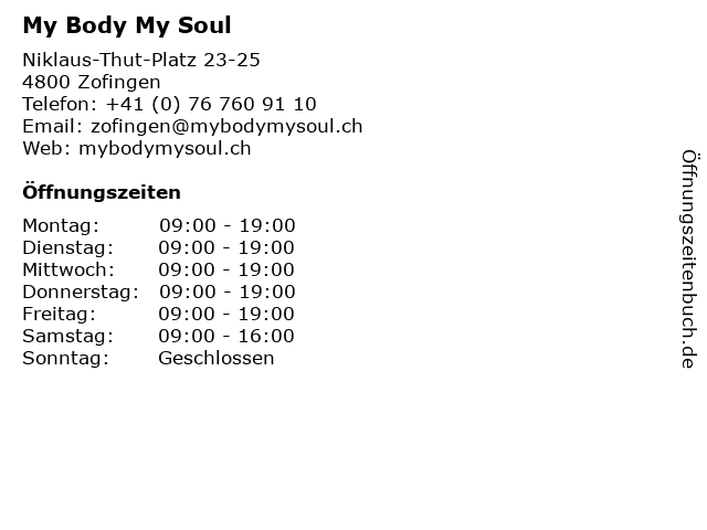 | Öffnungszeiten My Body My Soul in Zofingen anzeigen | |