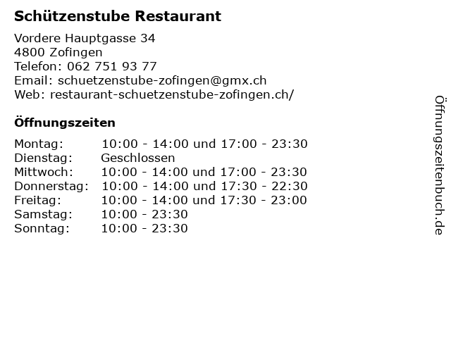 | Öffnungszeiten Schützenstube Restaurant in Zofingen anzeigen | |