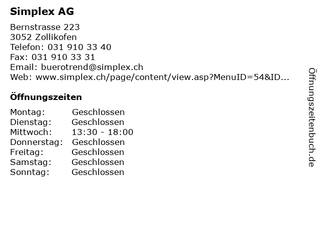 | Öffnungszeiten Simplex AG in Zollikofen anzeigen | |