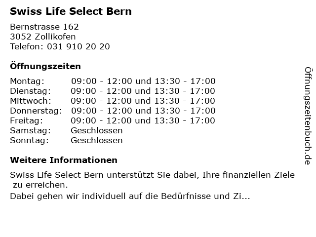 | Öffnungszeiten Swiss Life Select Bern in Zollikofen anzeigen | |