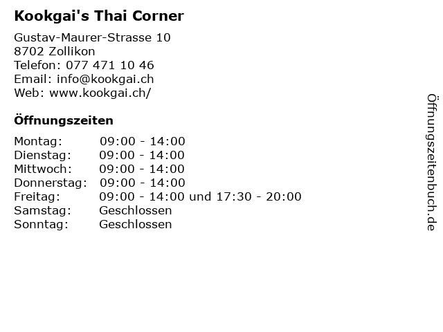 | Öffnungszeiten Kookgai's Thai Corner in Zollikon anzeigen | |
