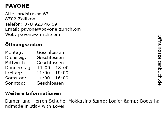 | 1 PAVONE Timeless shoes with soul I Designed in Zurich I Handcrafted in Italy I Boots I Loafers I Mokassins for Men & Wome (Entfernung: 0,00 km) Alte Landstrasse 67, 8702 Zollikon 6 |