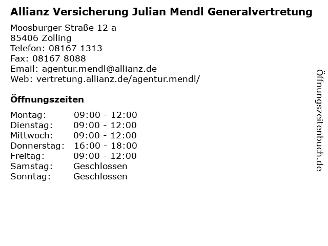 2 Allianz Versicherung Inge Santoro Hauptvertretung (Entfernung: 5,23 km) Landshuter Straße 80, 85356 Freising 3 Allianz Versicherung Florian Alt Hauptvertretung (Entfernung: 11,17 km) Taubenstraße 7, 85368 Moosburg 5 Allianz Versicherung Edon Murtezi Hauptvertretung (Entfernung: 17,01 km) Bahnhofstraße 42, 85375 Neufahrn bei Freising 6 Allianz Versicherung Ajna Berisha-Murtezi Hauptvertretung (Entfernung: 17,01 km) Bahnhofstraße 42, 85375 Neufahrn bei Freising |