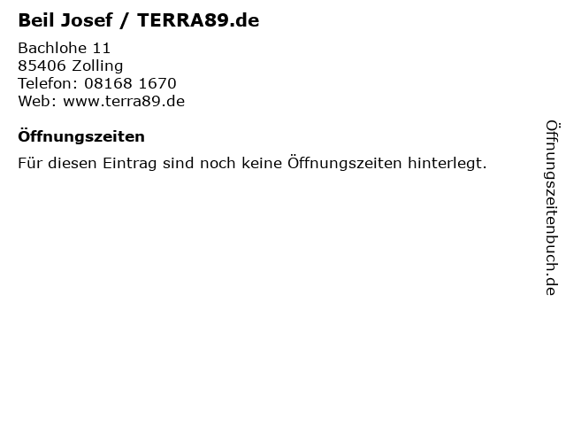 | Öffnungszeiten Beil Josef / TERRA89.de in Zolling anzeigen | |
