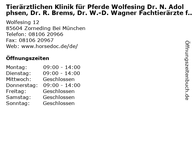 Branchen & Suchbegriffe zu Tierärztlichen Klinik für Pferde Wolfesing Dr. N. Adolphsen, Dr. R. Brems, Dr. W.-D. Wagner Fachtierärzte für Pferde:adolphsen, brems, d., dr., fachtierärzte, klinik, n., pferde, r., sprechzeiten, tierärztlichen, w., wagner, wolfesing |