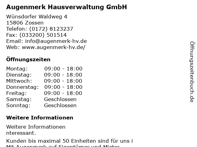| Öffnungszeiten Augenmerk Hausverwaltung GmbH in Zossen anzeigen | |