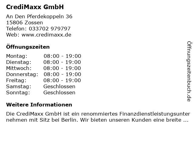 | Öffnungszeiten CrediMaxx GmbH in Zossen anzeigen | |