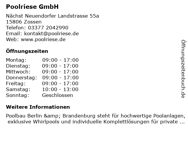 | Öffnungszeiten Poolriese GmbH in Zossen anzeigen | |