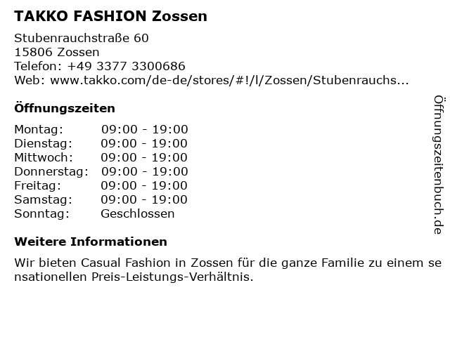 | Öffnungszeiten TAKKO FASHION Zossen in Zossen anzeigen | |