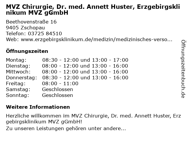 Branchen & Suchbegriffe zu MVZ Chirurgie, Dr. med. Annett Huster, Erzgebirgsklinikum MVZ gGmbH:annett, chirurgie, dr., erzgebirgsklinikum, ggmbh, huster, med., mvz |