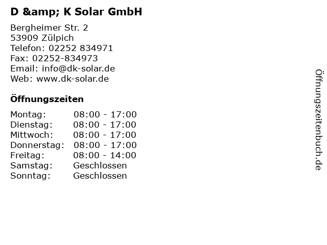 | Öffnungszeiten D & K Solar GmbH in Zülpich anzeigen | |