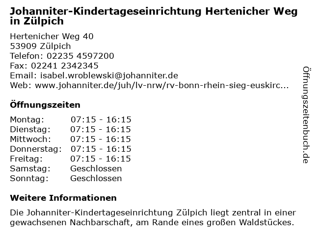 Branchen & Suchbegriffe zu Johanniter-Kindertageseinrichtung Hertenicher Weg in Zülpich:agentur für kinderbetreuung, gemeinnützige organisation, hertenicher, hilfsorganisation, johanniter, kindertageseinrichtung, sozialarbeit, verband, weg, wohlfahrtseinrichtung |