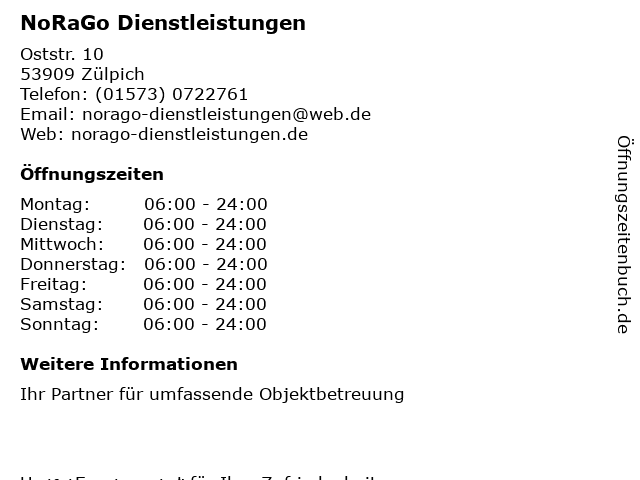 | Öffnungszeiten NoRaGo Dienstleistungen in Zülpich anzeigen | |