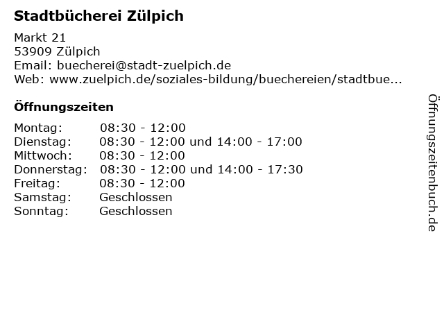 | Öffnungszeiten Stadtbücherei Zülpich in Zülpich anzeigen | |