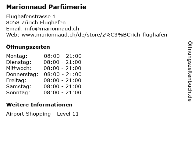 | Öffnungszeiten Marionnaud Parfümerie in Zürich Flughafen anzeigen | |