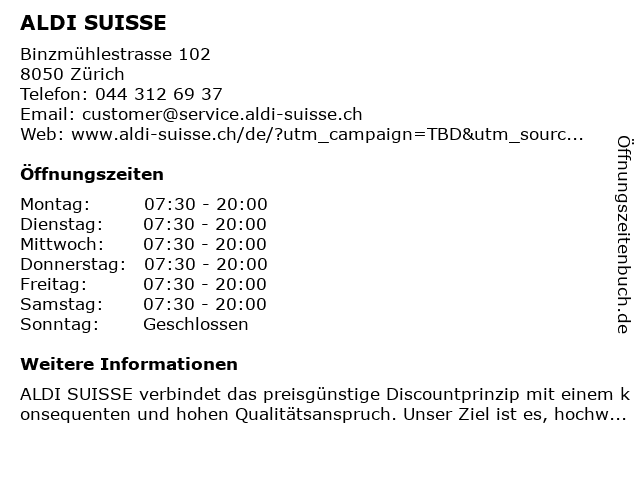 | Öffnungszeiten ALDI SUISSE in Zürich anzeigen | |
