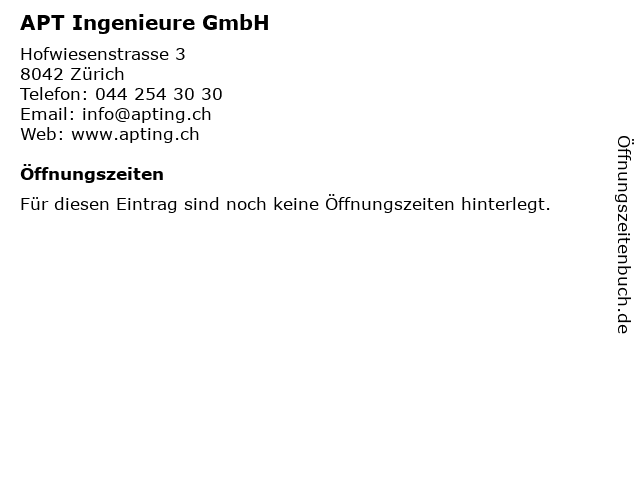| Öffnungszeiten APT Ingenieure GmbH in Zürich anzeigen | |