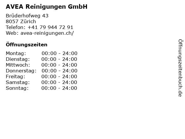 | Öffnungszeiten AVEA Reinigungen GmbH in Zürich anzeigen | |
