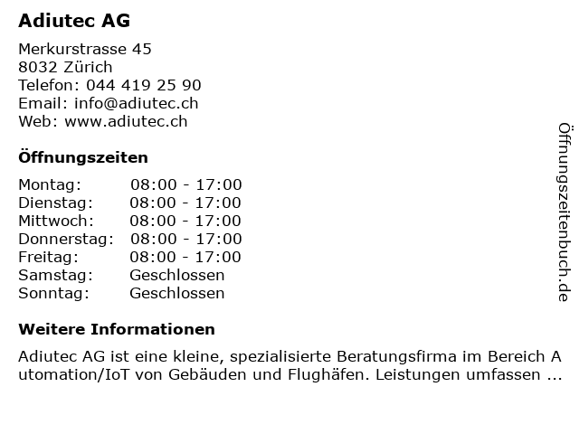 | Öffnungszeiten Adiutec AG in Zürich anzeigen | |