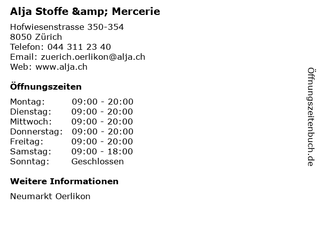 | Öffnungszeiten Alja Stoffe & Mercerie in Zürich anzeigen | |