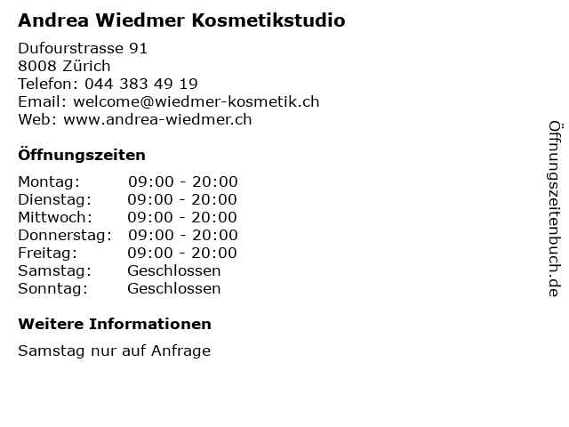 | Öffnungszeiten Andrea Wiedmer Kosmetikstudio in Zürich anzeigen | |