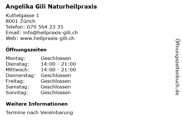 | Öffnungszeiten Angelika Gili Naturheilpraxis in Zürich anzeigen | |