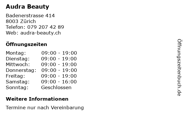 | Öffnungszeiten Audra Beauty in Zürich anzeigen | |