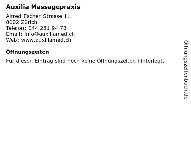 | Öffnungszeiten Auxilia Massagepraxis in Zürich anzeigen | |