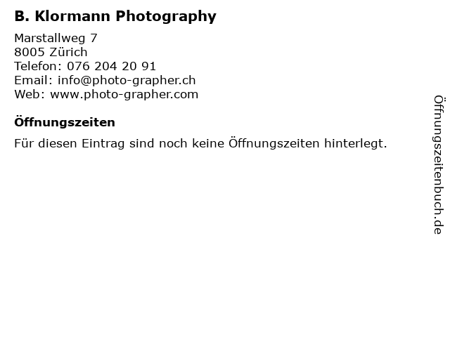 | Öffnungszeiten B. Klormann Photography in Zürich anzeigen | |