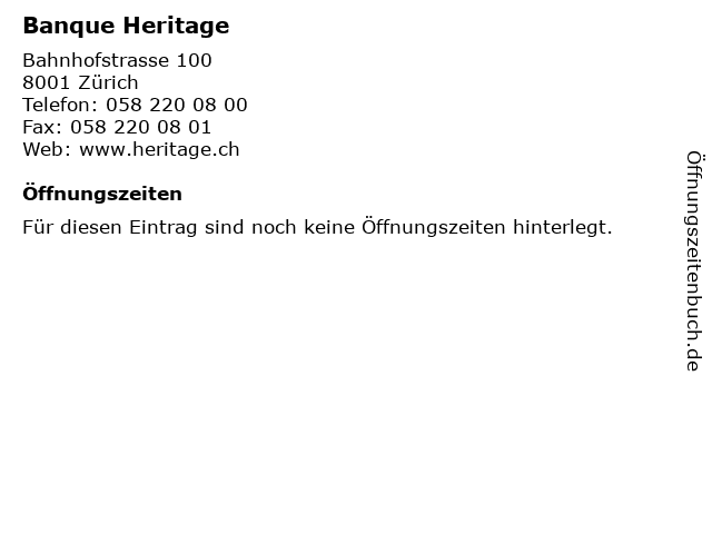 | Öffnungszeiten Banque Heritage in Zürich anzeigen | |