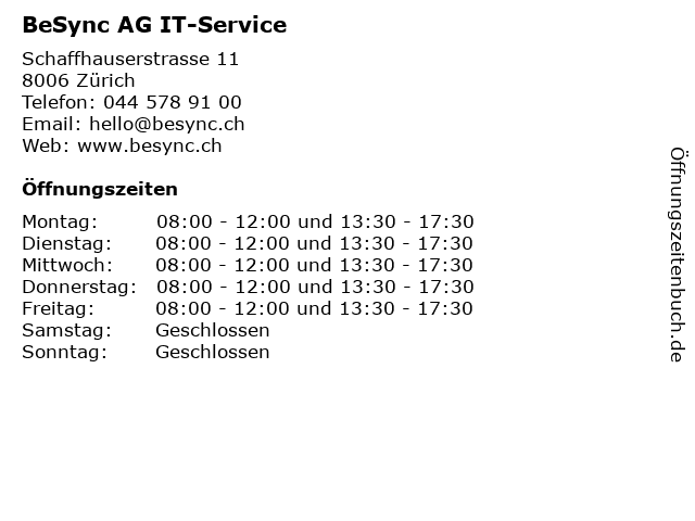 | Öffnungszeiten BeSync AG IT-Service in Zürich anzeigen | |