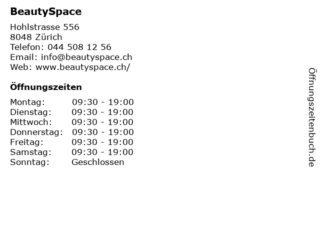 | Öffnungszeiten BeautySpace in Zürich anzeigen | |
