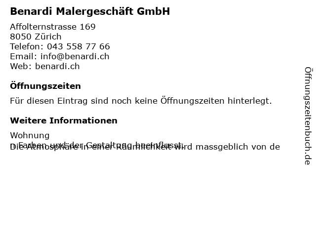 | Öffnungszeiten Benardi Malergeschäft GmbH in Zürich anzeigen | |