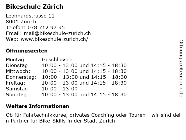 | Öffnungszeiten Bikeschule Zürich in Zürich anzeigen | |