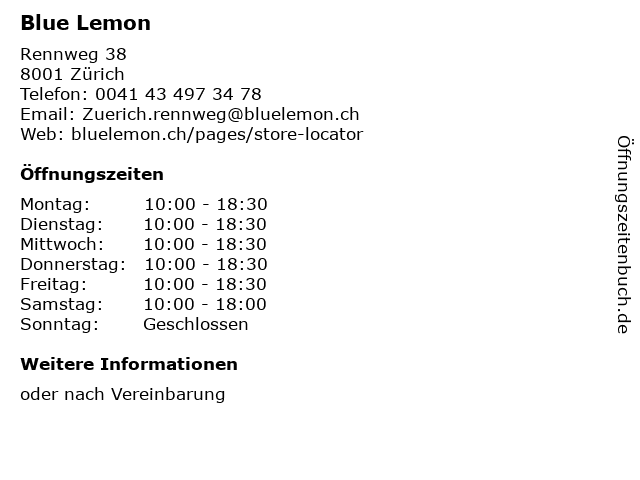 | Öffnungszeiten Blue Lemon in Zürich anzeigen | |