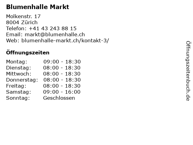 | Öffnungszeiten Blumenhalle Markt in Zürich anzeigen | |