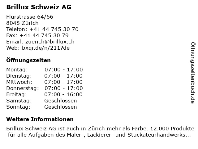 | Öffnungszeiten Brillux Schweiz AG in Zürich anzeigen | |