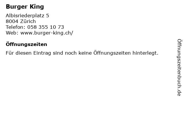 | Öffnungszeiten Burger King in Zürich anzeigen | |