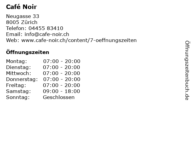 | Öffnungszeiten Café Noir in Zürich anzeigen | |